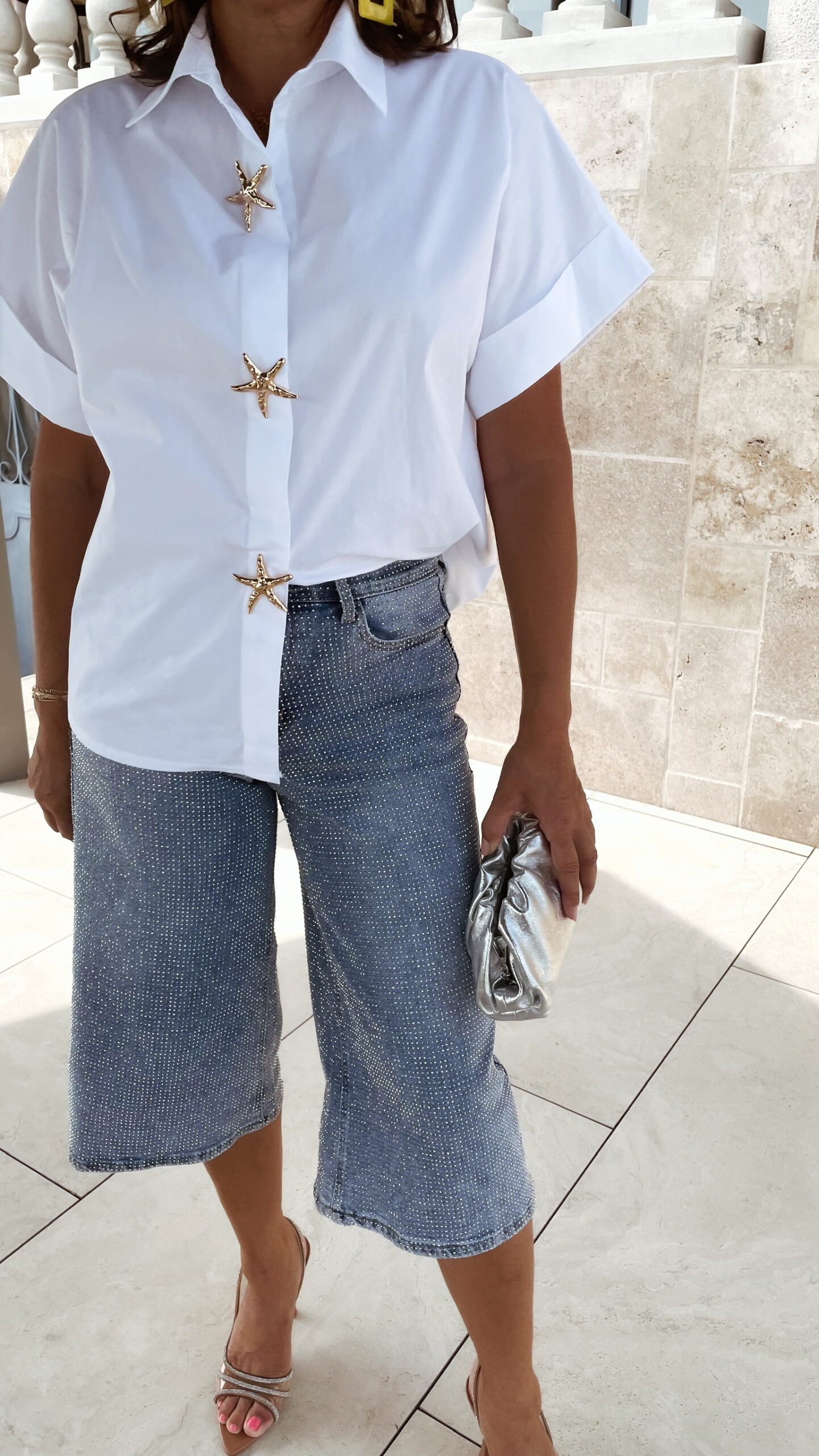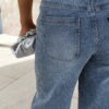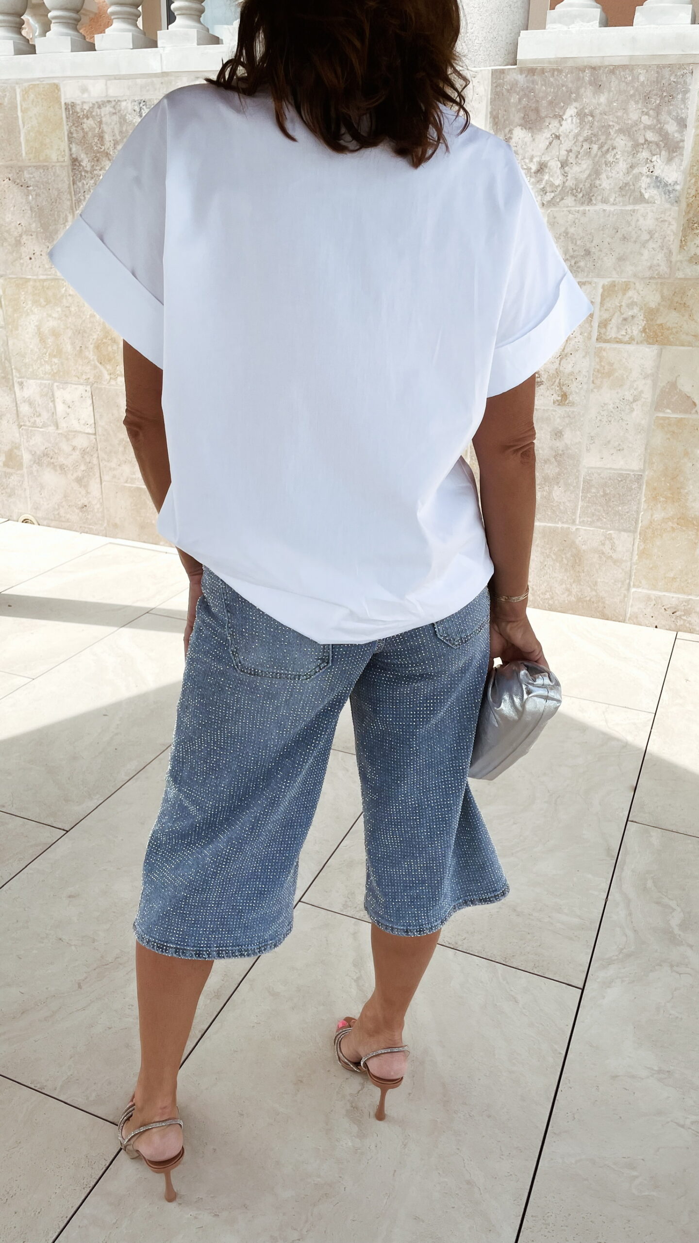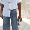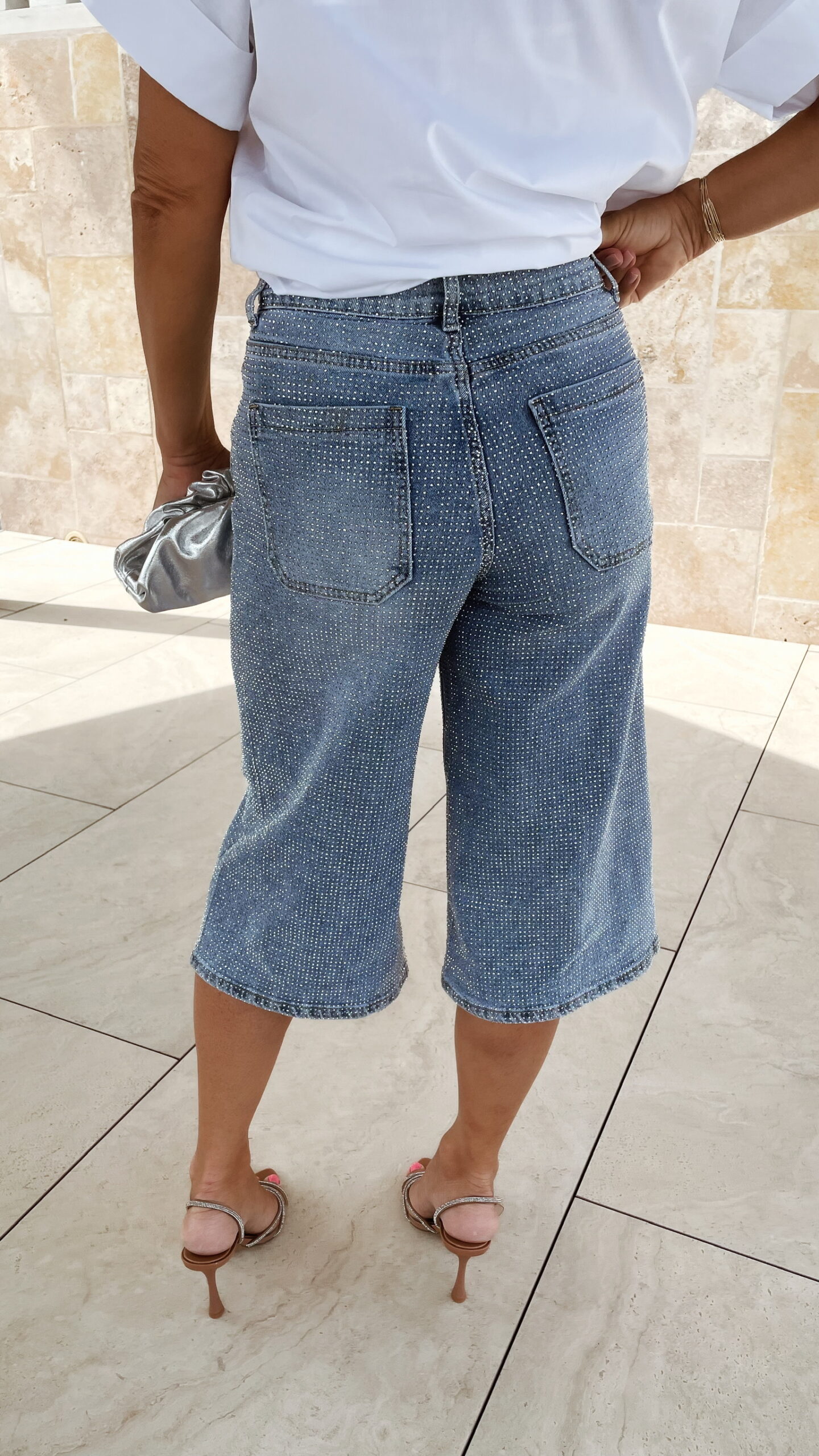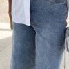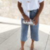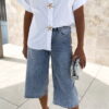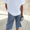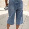 Bermuda jean bleu clair avec strass avant et arrière.