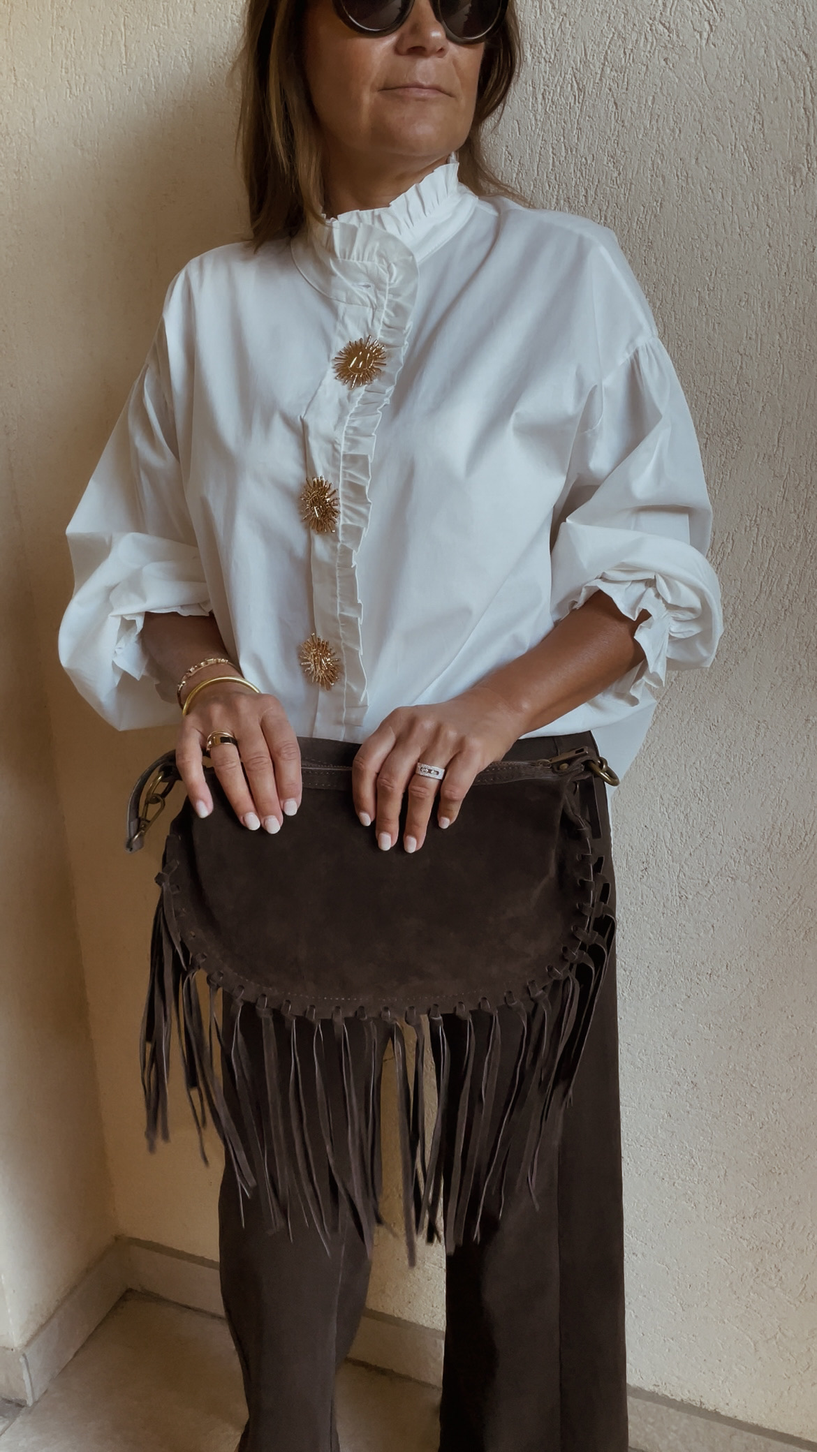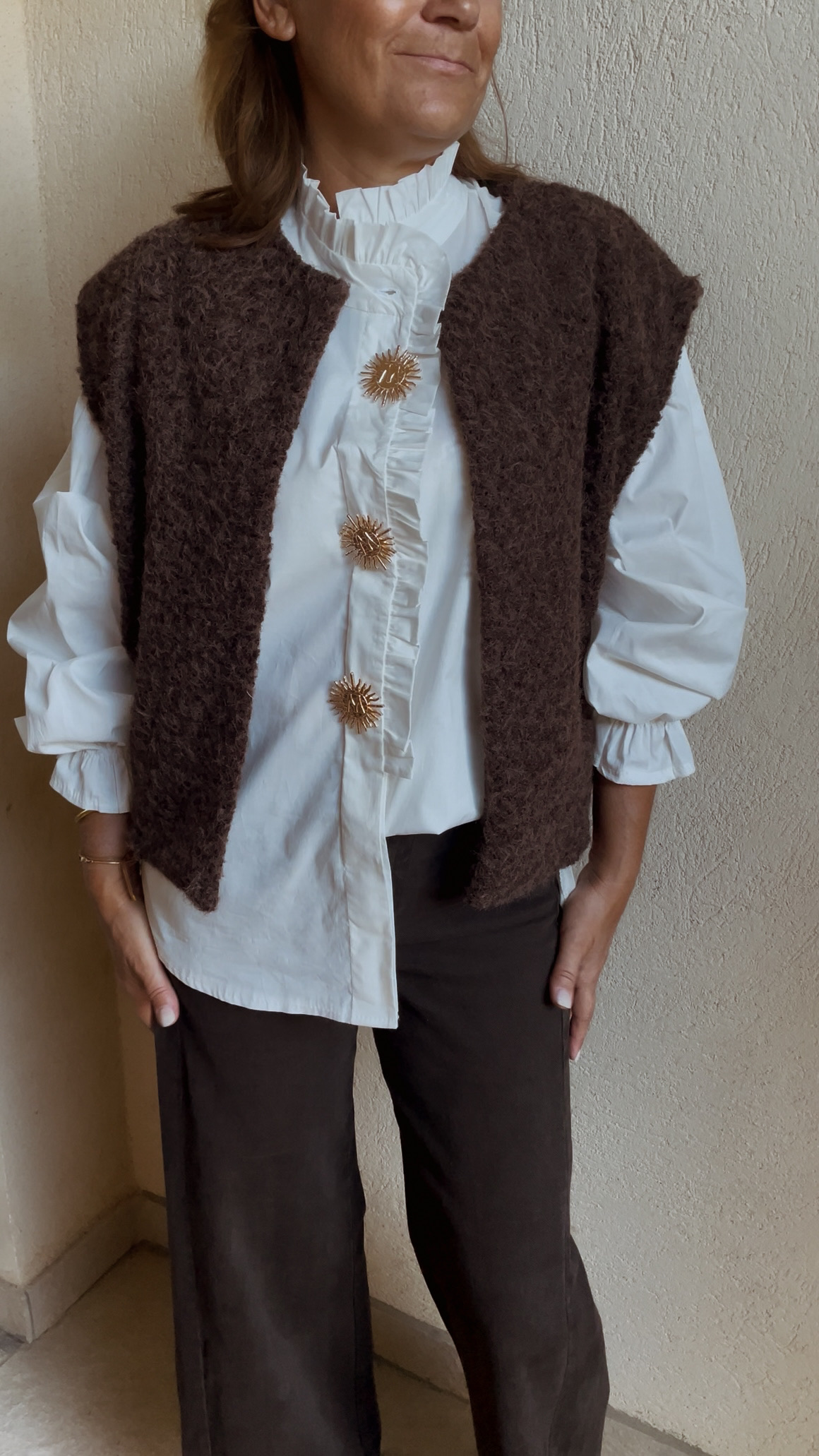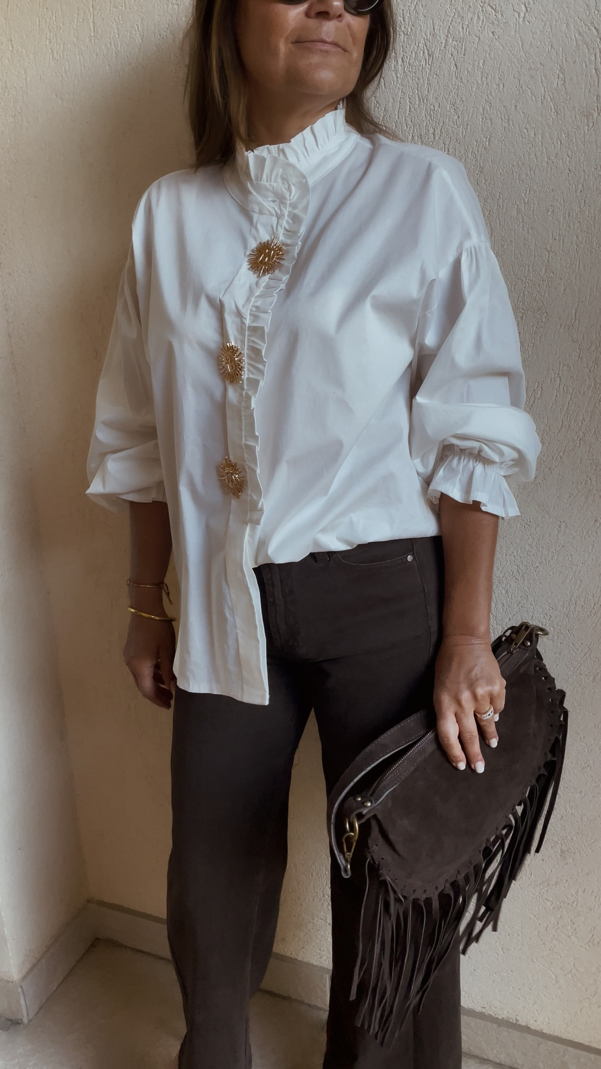 Col montant avec fronces, fermé par des boutons et 3 broches soleil amovibles.