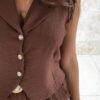 Gilet sans manche, boutons à l’avant, col V et élastique au dos.