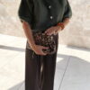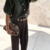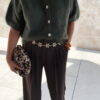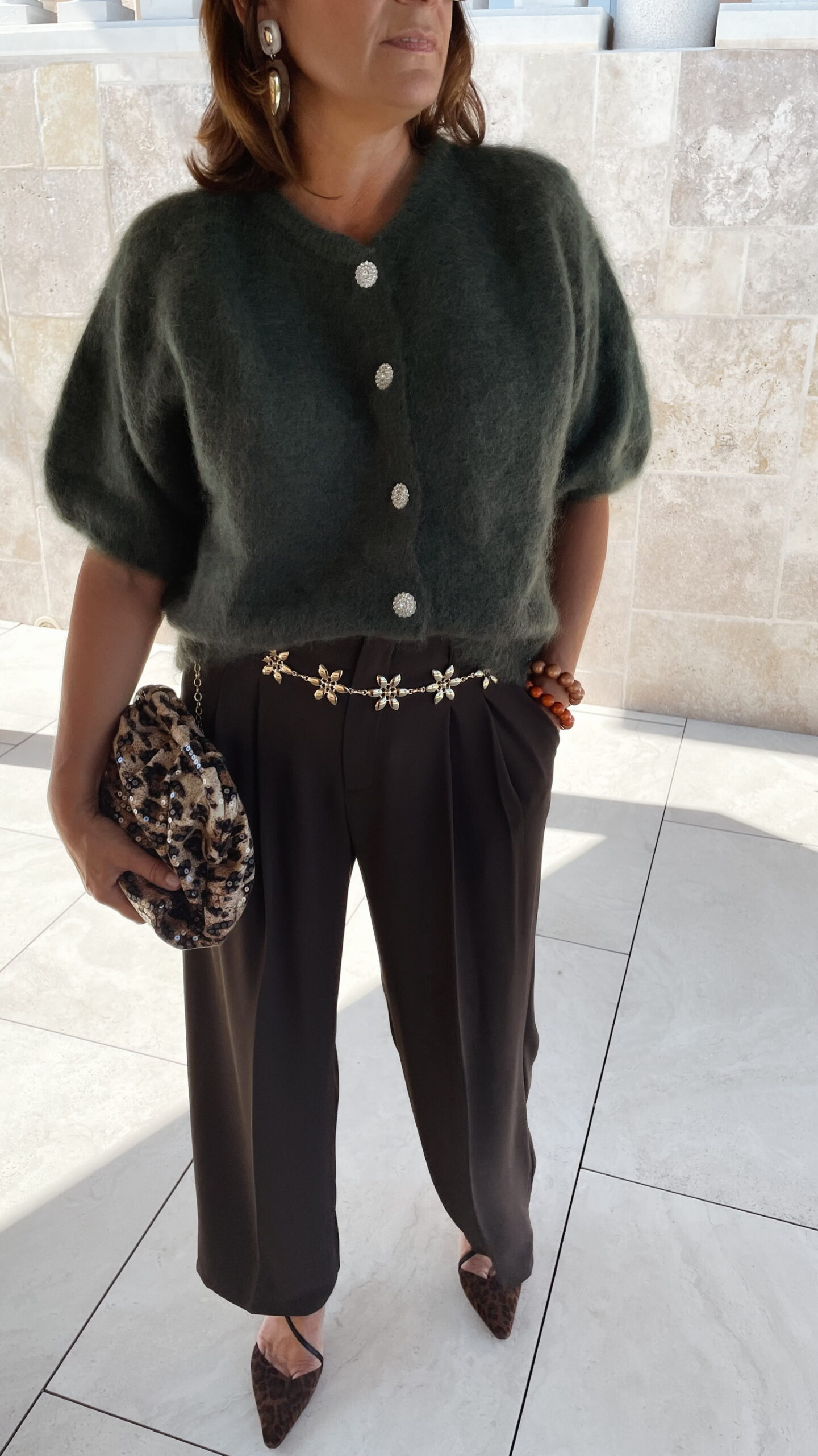 -Le gilet kaki Gaspard est porté avec le pantalon marron Giorgio, le sac boum leopard, la ceinture chaine dorée fleurs et le duo bracelet terracotta camel.