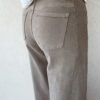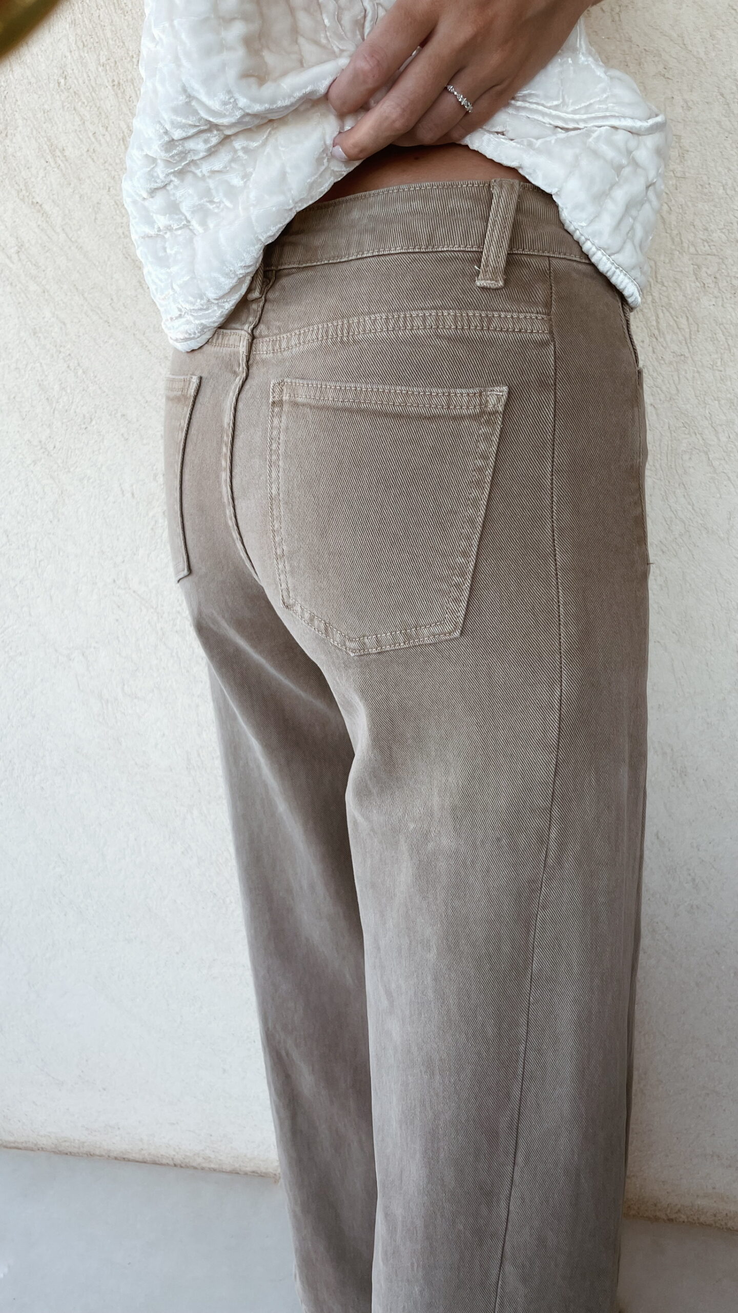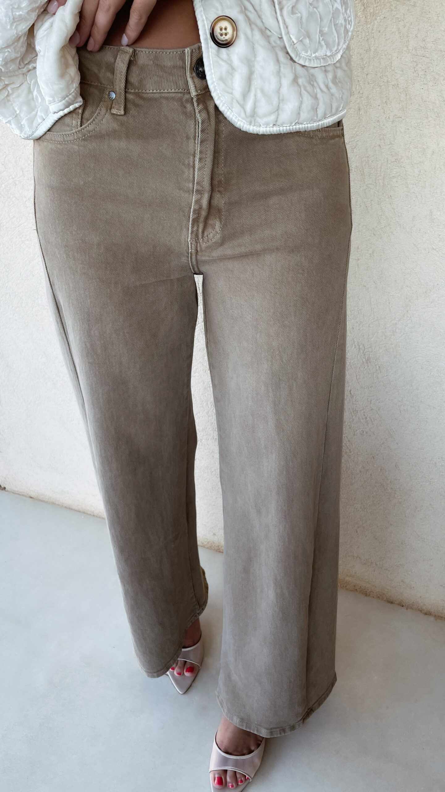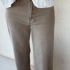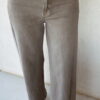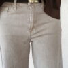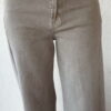 Pantalon beige coupe jeans taille haute et bas évasé.