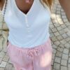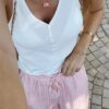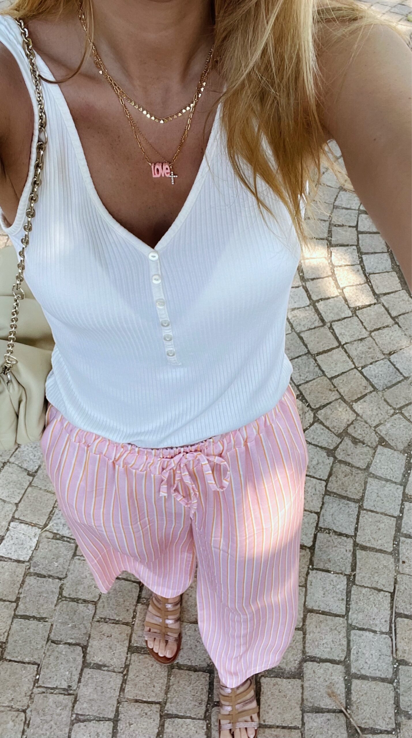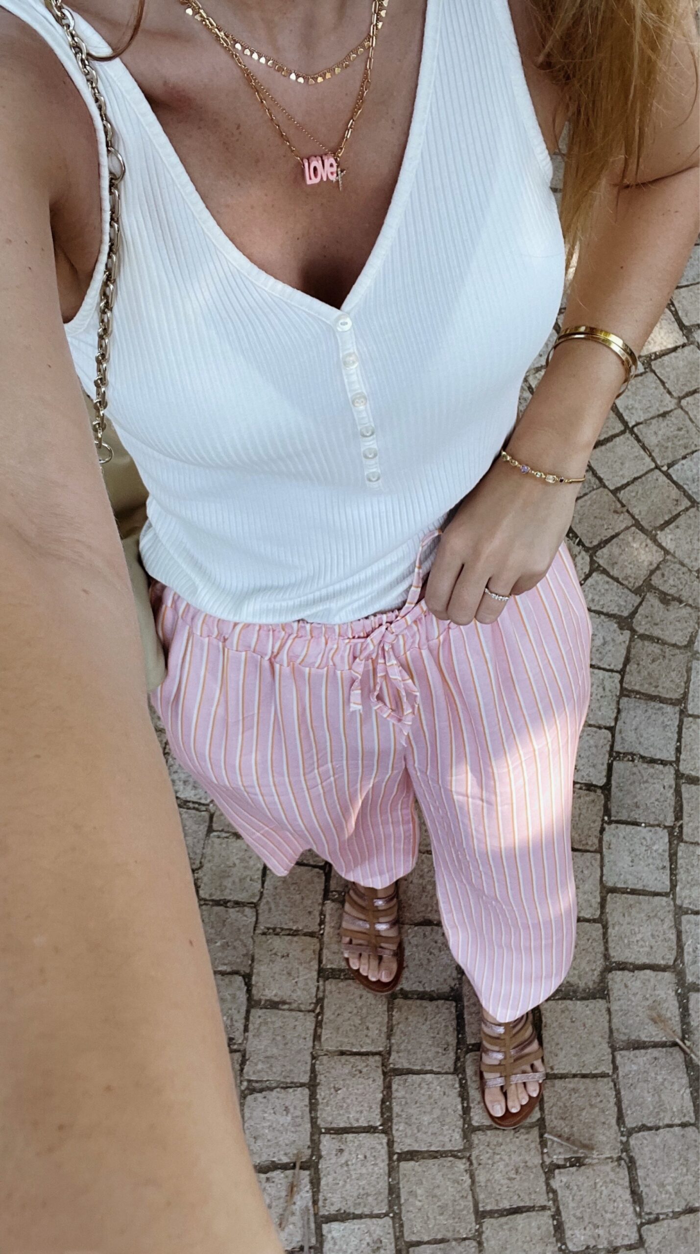 Pantalon rayé rose, blanc et orange.